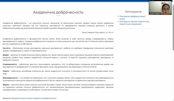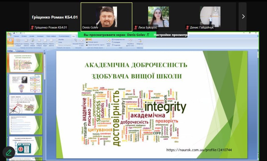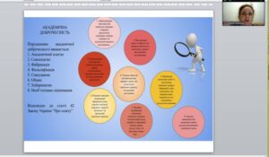 Під час зустрічей куратори разом зі здобувачами обговорили сутність академічної доброчесності як системи етичних принципів і норм, визначених Законом України «Про освіту». Здобувачі розглядали види порушень – від плагіату, списування, фабрикації до хабарництва й обману – та відповідальність, яку передбачає законодавство за їх допущення.