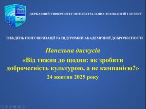 Завершуючи Тиждень популяризації та дотримання академічної доброчесності, організатори підкреслили, що проведені заходи – майстер-клас, квест, презентації, гостьова лекція, кураторські години та дискусії – стали не лише інформативними, а й об’єднавчими. Вони сприяли формуванню спільноти, для якої академічна доброчесність є не гаслом, а частиною університетської культури, що забезпечує якість освіти, довіру та конкурентоспроможність Державного університету інтелектуальних технологій і зв’язку.