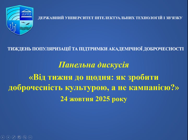 Завершуючи Тиждень популяризації та дотримання академічної доброчесності, організатори підкреслили, що проведені заходи – майстер-клас, квест, презентації, гостьова лекція, кураторські години та дискусії – стали не лише інформативними, а й об’єднавчими. Вони сприяли формуванню спільноти, для якої академічна доброчесність є не гаслом, а частиною університетської культури, що забезпечує якість освіти, довіру та конкурентоспроможність Державного університету інтелектуальних технологій і зв’язку.