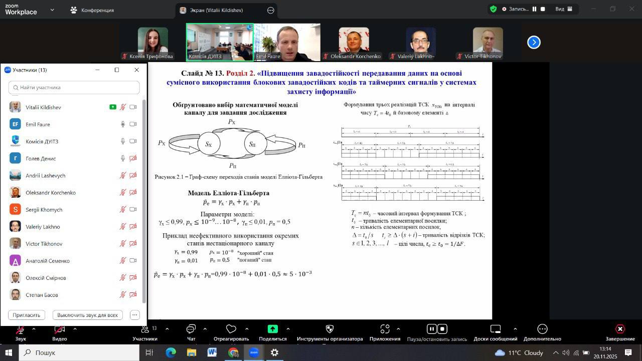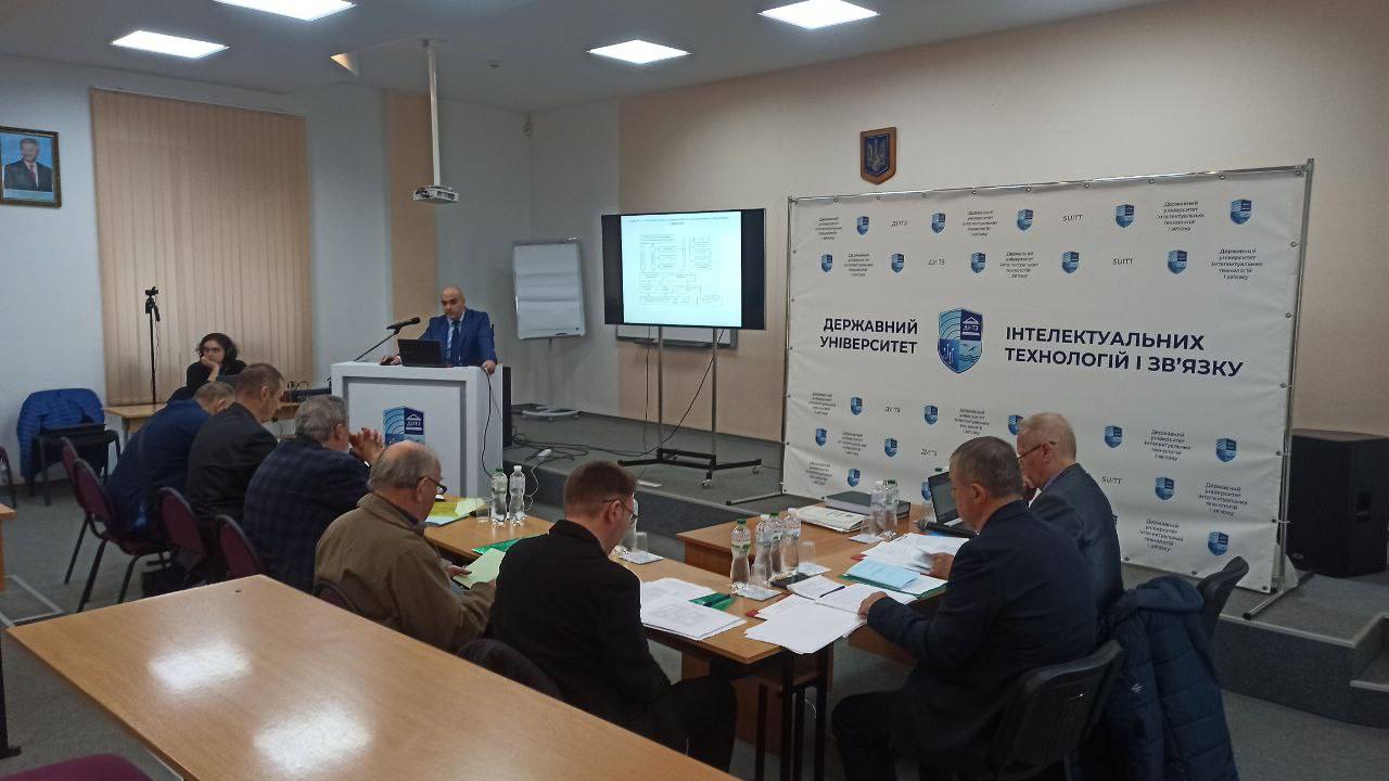Сьогодні, 20.11.2025 року, в Державному університеті інтелектуальних технологій і зв’язку працювала Спеціалізована вчена рада Д41.113.03. На її засіданні відбувся захист дисертації на здобуття наукового ступеня доктора технічних наук Кільдішева Віталія Йосиповича за спеціальністю 05.13.21 – системи захисту інформації.