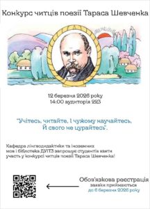 Кафедра лінгводидактики та іноземних мов і бібліотека ДУІТЗ запрошує студентів взяти участь у конкурсі читців поезії Тараса Шевченка.
