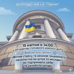 15 квітня о 14:00 у 223 аудиторії головного корпусу ДУІТЗ відбудеться тренінг для студентської молоді «Вплив стресу та ризиків гендерного насильства на дітей та молодь: як підтримати себе та запобігти шкоді».