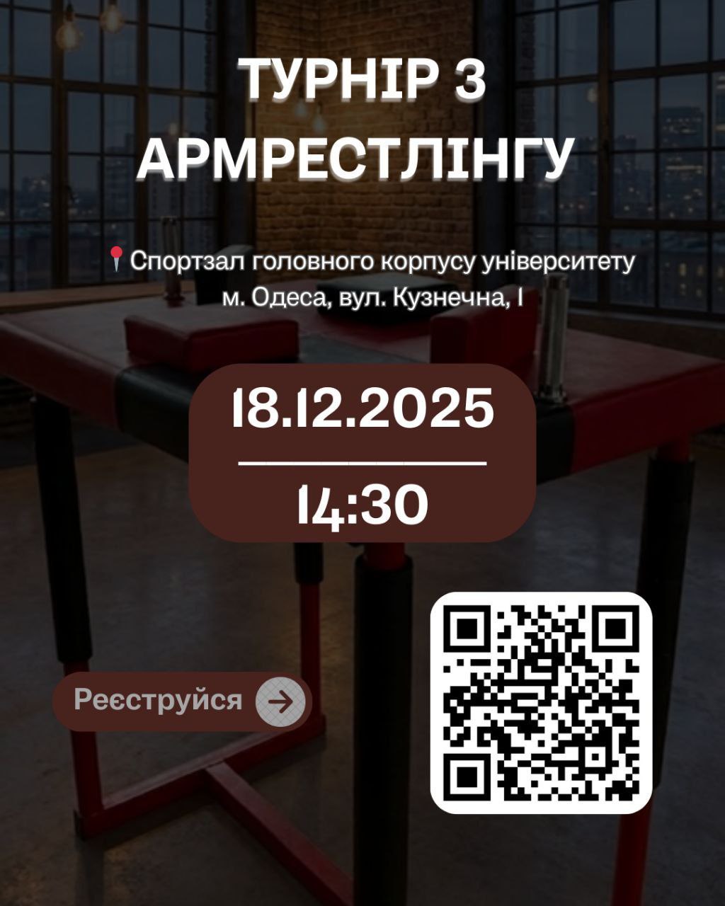 18 грудня в нашому університеті пройде спортивний турнір з армрестлінгу. Це чудова нагода для студентів продемонструвати свою фізичну підготовку, витривалість та силу духу.