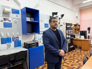 Екскурсію лабораторією технічних засобів охорони та захисту інформації кафедри кібербезпеки та технічного захисту інформації провели Сергій Стайкуца, керівник лабораторії, кандидат філософських наук, доцент кафедри КБ та ТЗІ, помічник декана ФІТК з роботи з партнерами і стейкхолдерами, та Максим Івахненко, старший викладач кафедри КБ та ТЗІ. Гостям продемонстрували обладнання систем відеоспостереження, пожежної безпеки та навчальні стенди, які використовуються в освітньому процесі.
