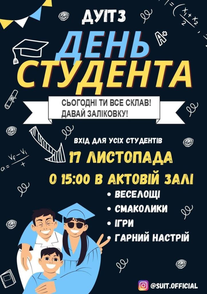 Шановні студенти Студентська рада ДУІТЗ запрошує всіх охочих приєднатись до святкування Всесвітнього дня студента.Захід відбудеться в п’ятницю, 17 листопада о 15:00 в актовій залі головного навчального корпусу ДУІТЗ за адресою: вул. Кузнечна, 1. На вас чекають різні ігри, веселощі, багато смаколиків та гарний настрій протягом усього свята. Під час заходу ви зможете добре відпочити, поспілкуватись […]