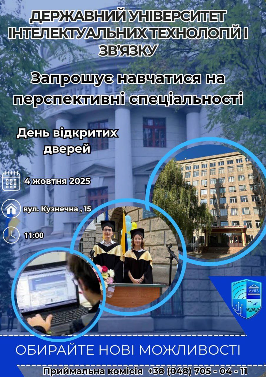 4 жовтня 2025 року Державний університет інтелектуальних технологій і зв’язку гостинно відкрив свої двері для майбутніх студентів. Захід відбувся в навчальному корпусі ДУІТЗ на вулиці Кузнечній, 15. Ця подія стала чудовою нагодою ближче познайомитися з університетом, його освітніми програмами та студентським життям.